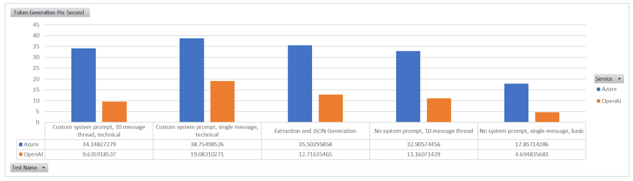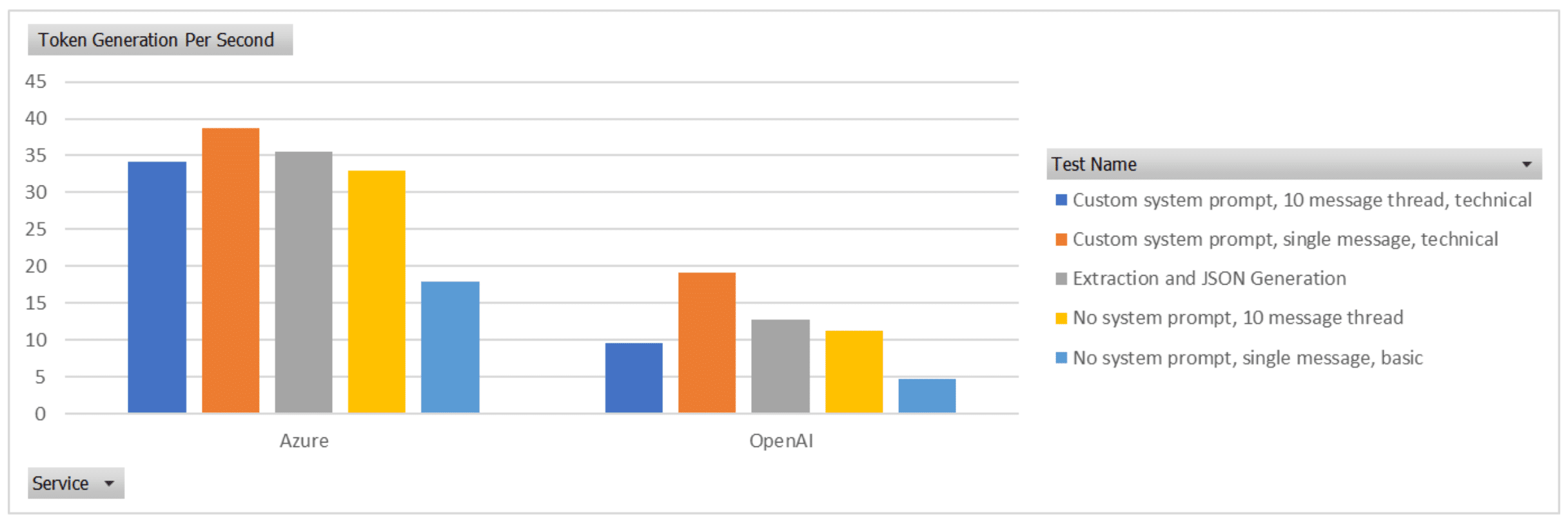 The amount of tokens that needed to be generated in the response can impact the time to respond, if one service was providing significantly longer responses, that will result in a longer completion time. The below image displays the average tokens generated per second for each service. Again, Azure significantly outperforms OpenAI by a factor of 2.77 times.