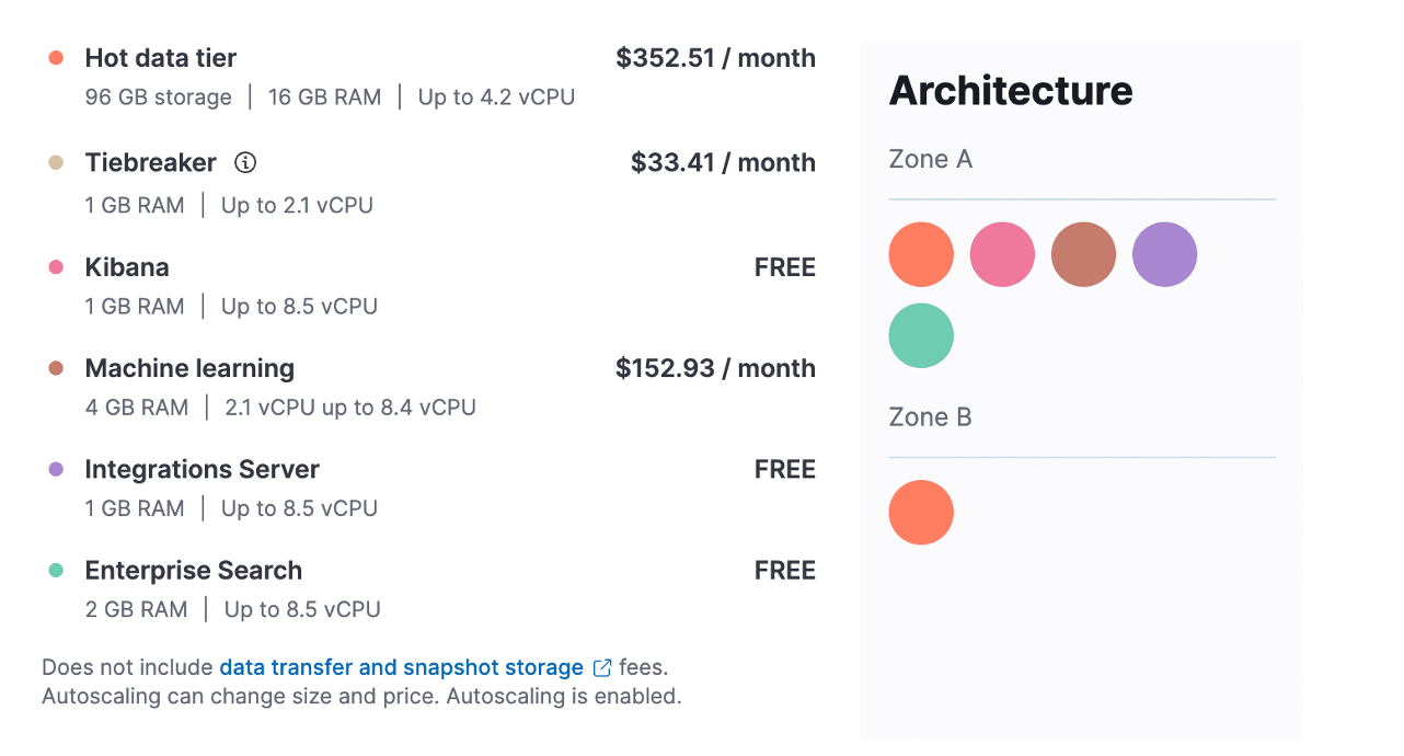 To self-host a model, you need to specify ML nodes. In Elastic Cloud, this is an additional node type. This specific node type is different in that it can be independently scaled but since in our use case and frankly most search use cases which need vectors created, the ML node will run continuously. ELSER, Elastic’s model, requires 4GB of RAM minimally. So, if you choose this option, you are adding a minimum of $150/month (pricing at the time of publish) to your consumption as seen below.